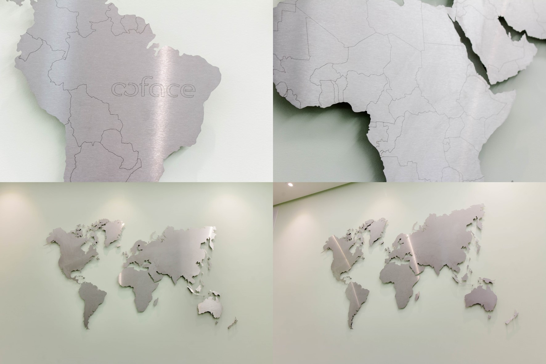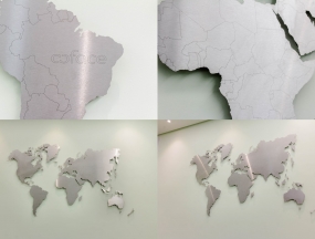 Mapa mundi em aço escovado com gravação do nome do cliente